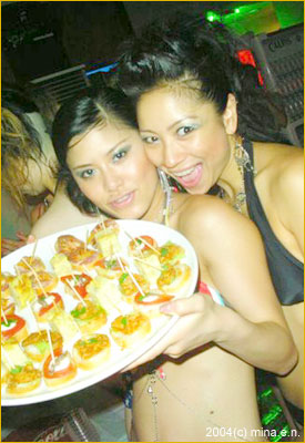 大人気!GFのFINGER FOODSサービスは"スペイン倶楽部"から特別深夜便でデリバリーされます。MIHO(L) & MARISSA(R)も大好き!!